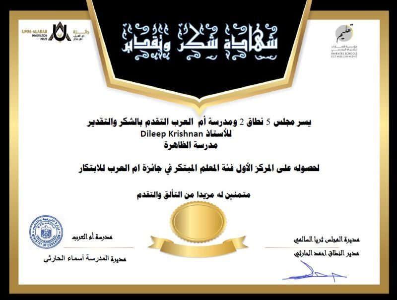 Recieved First Prize in the " Best Innovative Teacher " category in the Um Al Arab Innovation Award_Ministry of Education UAE