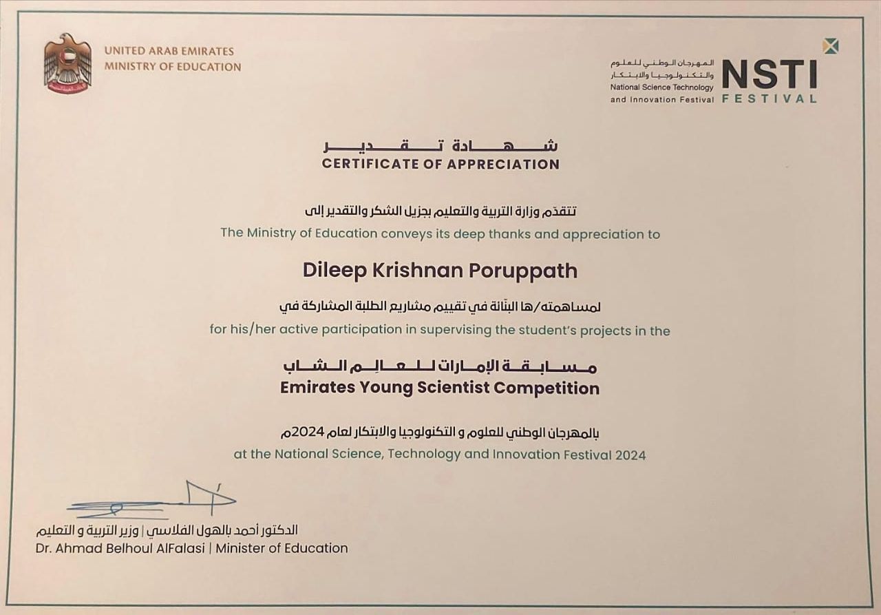 Recieved Appreciation from Dr. Ahmad Belhoul AlFalasi,Minister of Education UAE, for the active participation in supervising Student projects at Emirates Young Scientist Competition during NSTI Festival